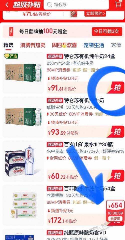 2、”天猫超市吃货喵”直播间领9折券,加购该品1,买的少就用从详情页的超级补贴领199-30,加购1,88会员95折,然后凑满999-100,特仑苏共5件到手320多,价格绝对好价