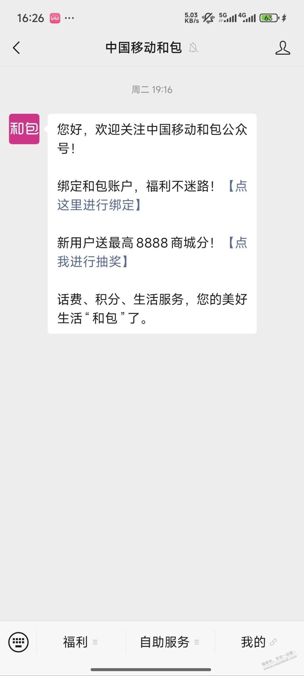 1、中国移动和包公众号,取关再关注,点抽奖,一般是500或888积分,另外下面三个任务,每个任务100积分,点一下返回即可领取,总共大约能得800 积分