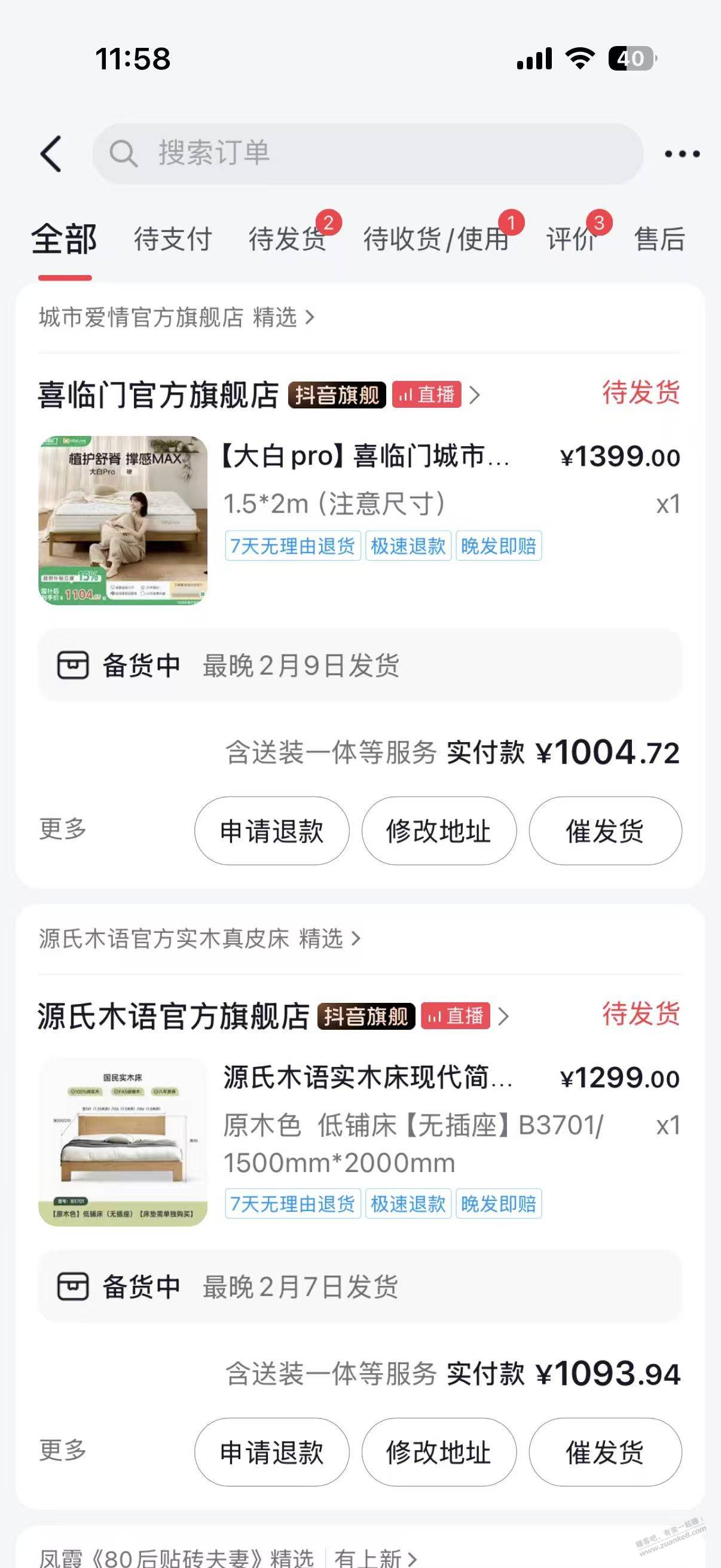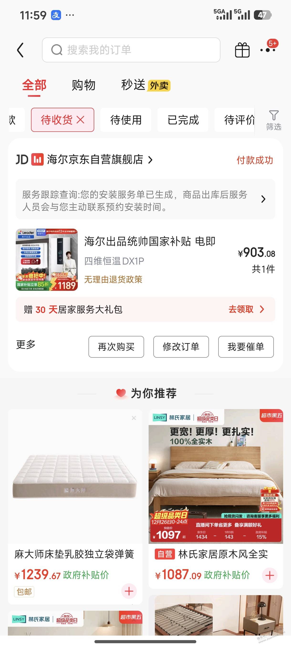 床垫买的喜临门大白pro1000,热水器买的8500W即热式热水器